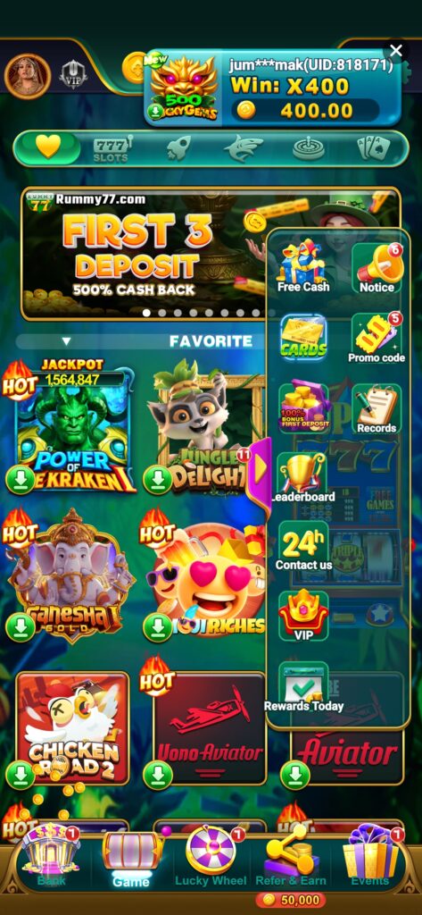 Is game main aapko 100+ Se Bhi Jyada games dekhne ko Milega. Jaise:- Rummy, Ludo, Aviator, Jet X, Dragen VS Tiger, Andar Bahar, Ganesh Gold, Chicken Road, 777 Slots, Teenpatti, Spin gold, e.t.c…