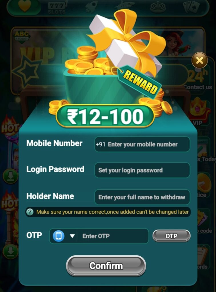 Friends, in this rummy 888 apk game, first of all you have to enter your mobile number of 10 digits.After that you have to set a login password, after that you have to enter your name, after that click on the OTP button. On clicking, OTP will be sent to your mobile number. Enter it and confirm.