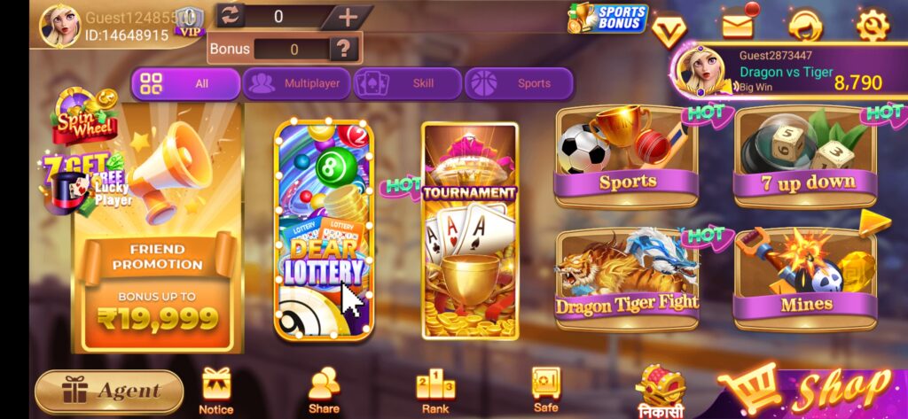 Friends, playing RummyApple game is very easy, first of all you have to open this game, after opening it, its home page will look something like this, out of which you will get to see many games. Like:- Ludo, Dragen VS Tiger, Lottery, 7up down, Tournament, Sportd, Mines, poker, Video poker, e.t.c.…